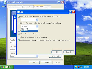 To enable ClearType, right-click on the Desktop and choose Properties>Appearance> Effects. The Effects dialog box appears. Check the box next to “Use the following method to smooth edges of screen fonts.” Select ClearType from the drop-down box, click OK, then click OK again. You’ll notice the difference in how type is displayed.