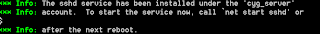 A new user for the Cygwin ssh service will be added,the corresponding file where that will be saved is /etc/passwd (C:cygwinetcpasswd).You can take a quick look at that file from Windows command prompt if interested,use “type passwd” at command prompt to display the file contents :