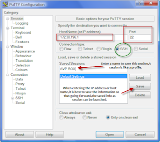 Once the IP/host name along with the connection type is entered,it is better if we save this as a session so that going forward we can simply load this session.Here,this is saved as AVP-BOX.
