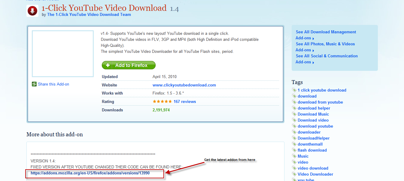 Download the latest version from here which works with the new YouTube code (some previous YouTube downloader add-ons in Firefox have stopped working or have glitches after the site was changed).