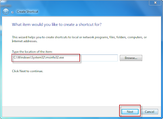 2.In the path for shortcut,type : C:WindowsSystem32msinfo32.exe